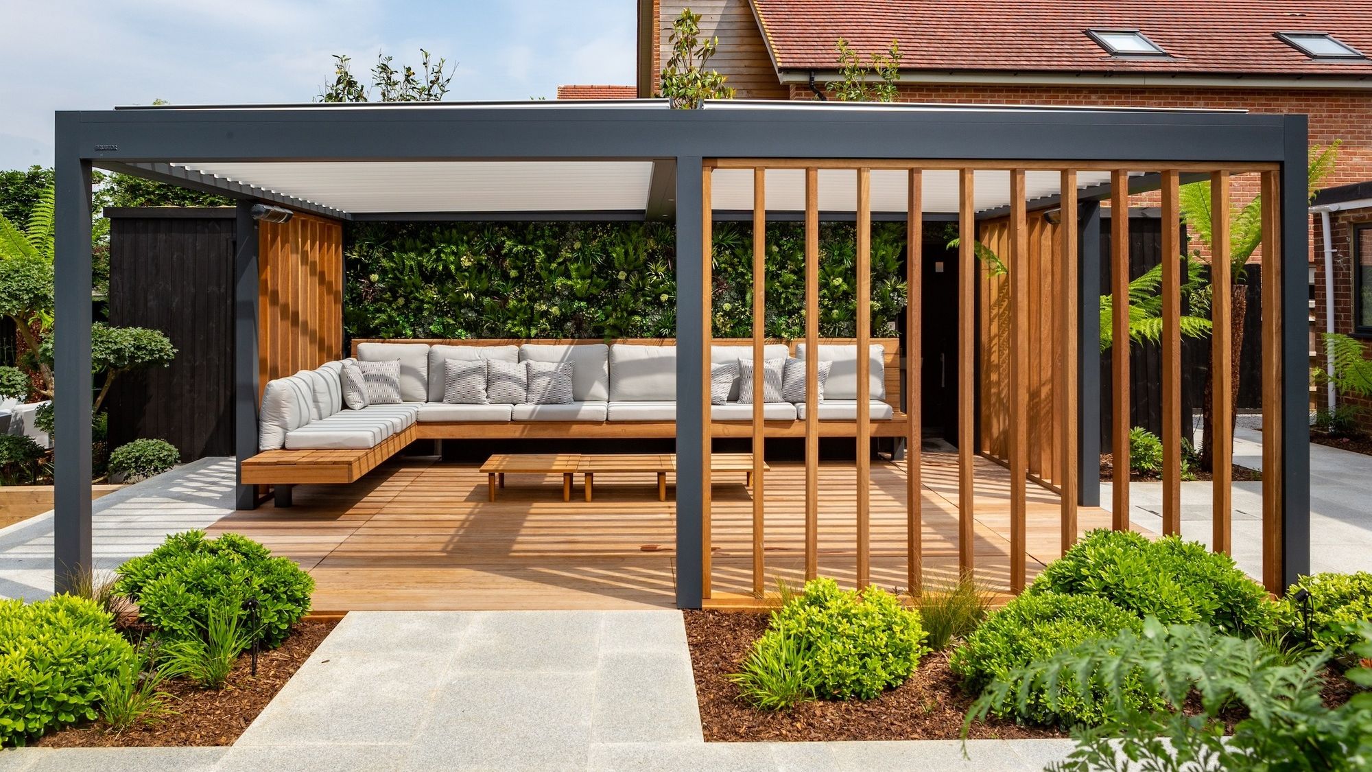 يمكن تركيب مظلة خشبية فوق منطقة الجلوس لخلق جو متعدد الحواس، مثل إضافة إضاءة، كما هو رائج في التصاميم الحديثة، هذا يحول الفناء إلى منطقة تجمع عائلي مريحة، مع الحفاظ على التهوية الطبيعية.
