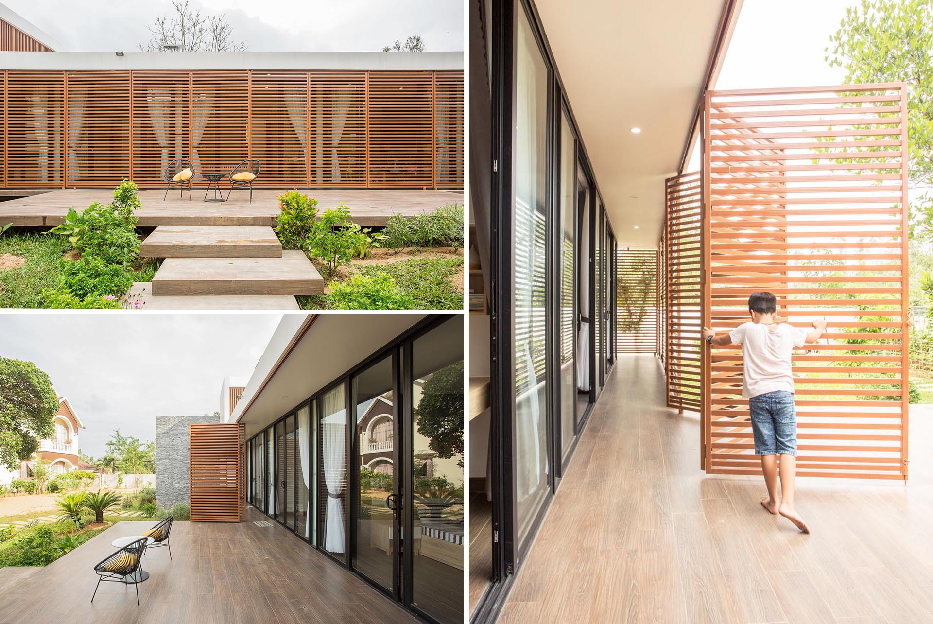 في أمثلة حقيقية، نجد منازل استخدمت سواتر خشبية لفصل الحديقة عن الجيران، مع مظلات قماشية لمناطق الشواء.